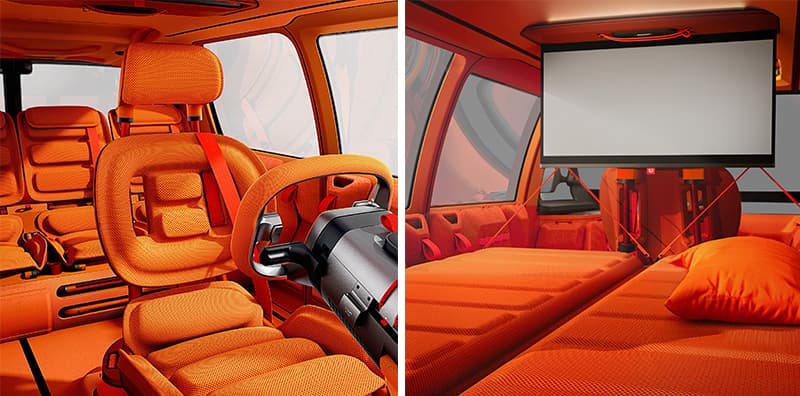 A modularidade é o ponto forte deste modelo. A segunda fila conta com três bancos individuais, mas é possível encaixar dois assentos adicionais à frente destes (embora recuados em relação ao condutor), criando uma lotação de seis lugares. O acesso é facilitado por portas laterais de correr duplas e pela ausência de um pilar central. Quando não são necessários, estes bancos extra podem ser recolhidos sob os assentos traseiros ou até removidos para serem usados como cadeiras de piquenique. Além disso, o habitáculo pode transformar-se numa zona de dormida para duas pessoas e o banco do condutor tem a capacidade de rodar 360 graus quando o veículo está imobilizado.